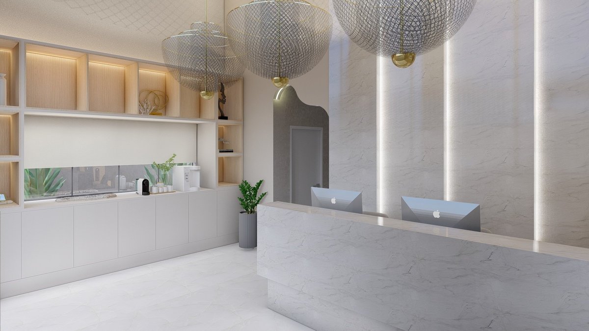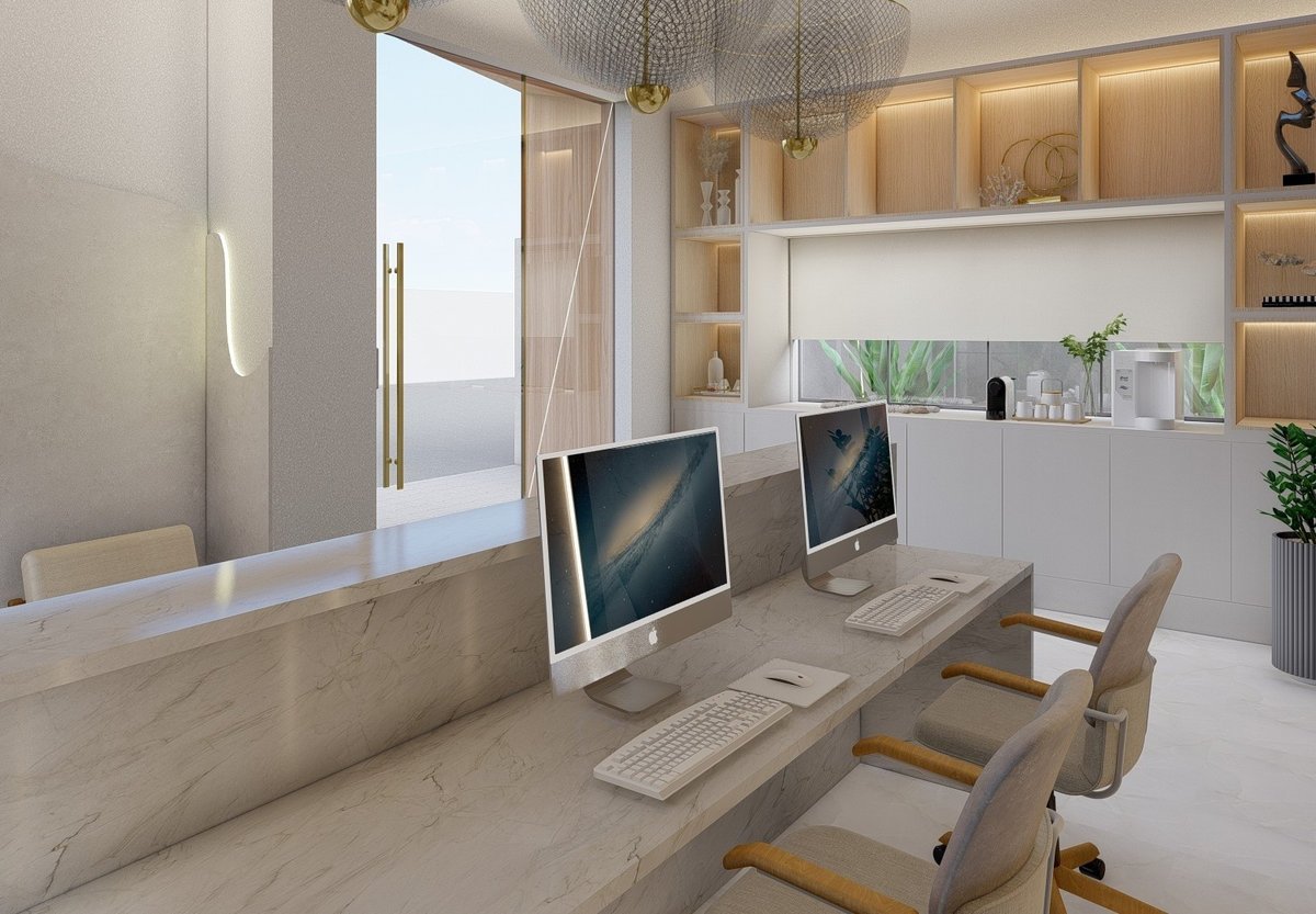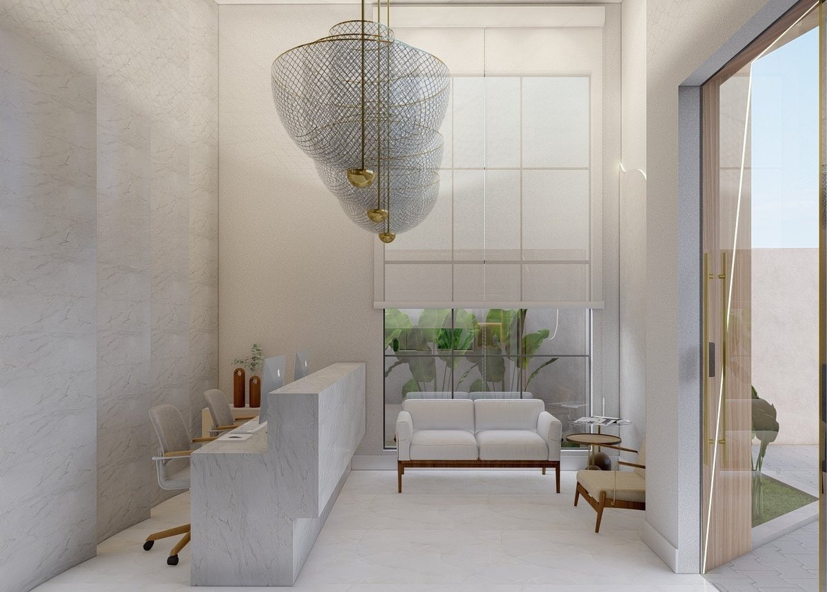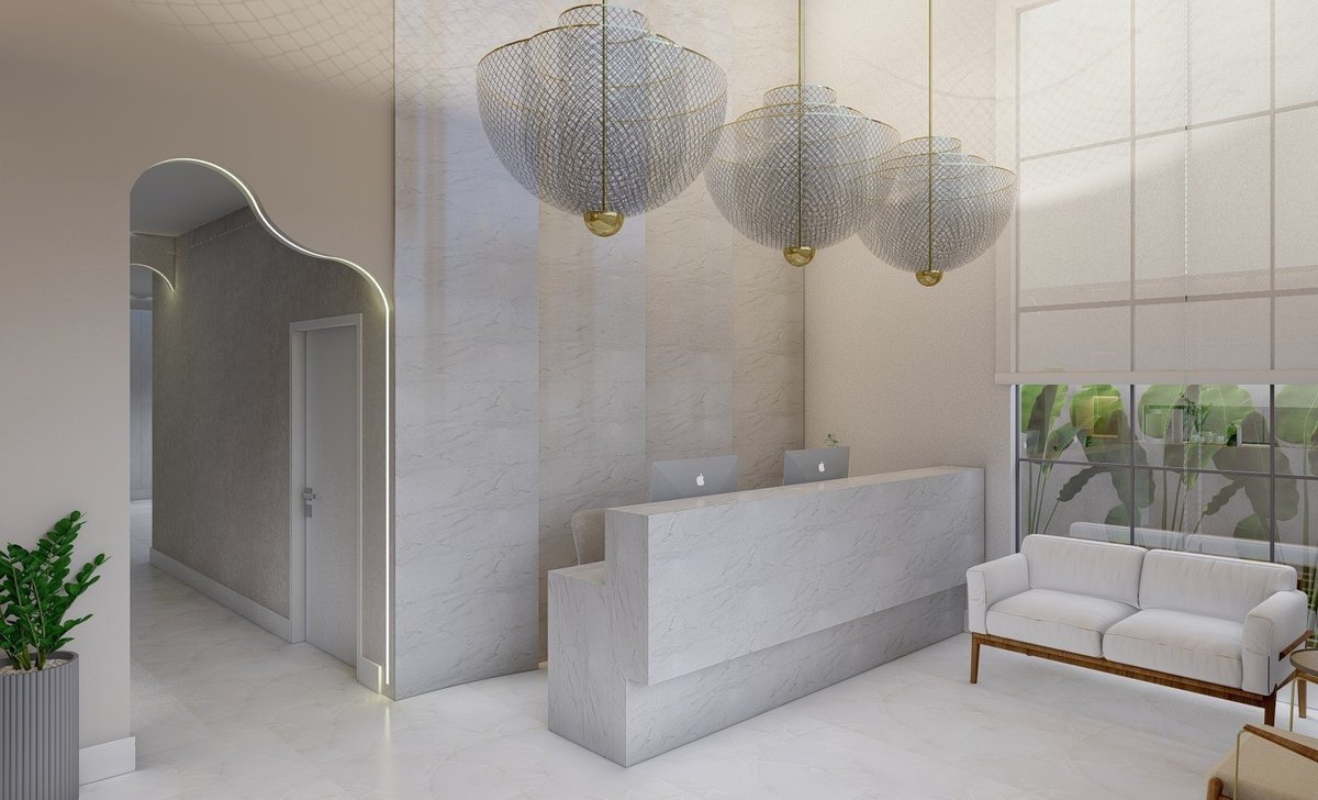 No interior, a recepção ampla e iluminada cria uma atmosfera leve e aconchegante. Materiais nobres, iluminação suave e mobiliário confortável traduzem o equilíbrio entre estética e funcionalidade, trazendo acolhimento e tranquilidade às pacientes.