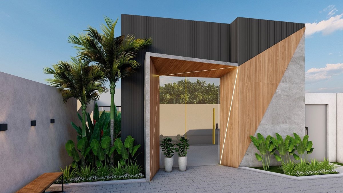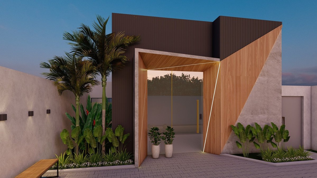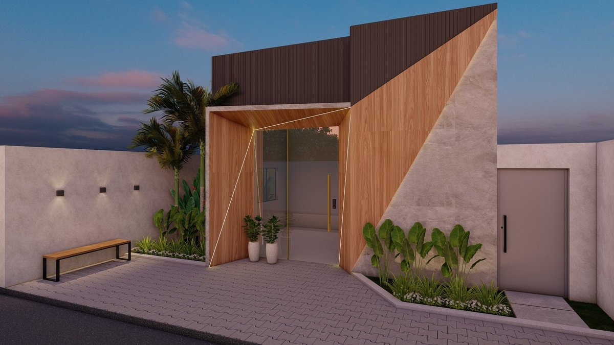 Na fachada, a combinação de volumes modernos, revestimentos em madeira, pedra e linhas marcantes transmite elegância e contemporaneidade, reforçando a identidade de um ambiente que preza pelo cuidado e excelência.
